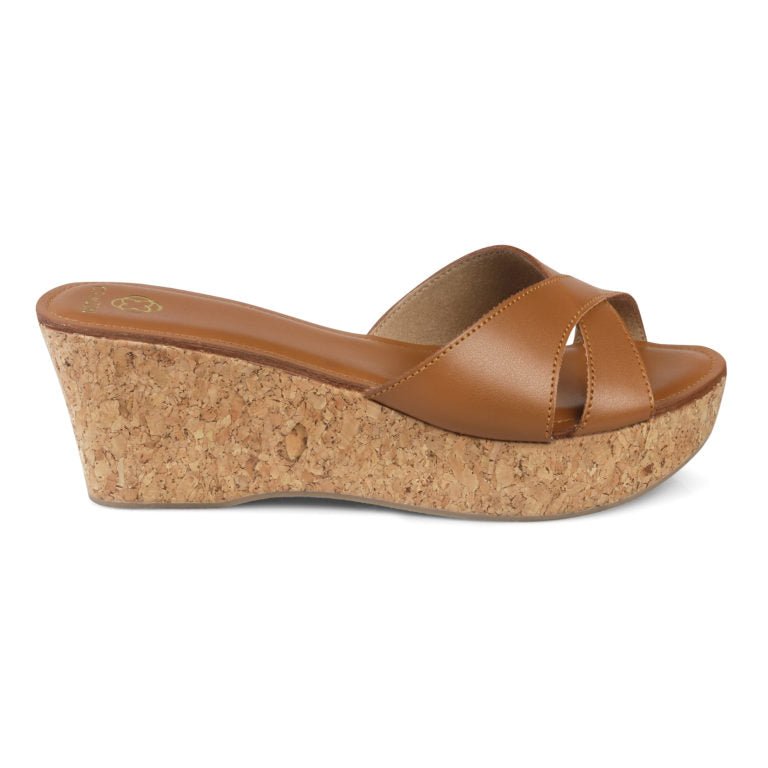 Our tan cork heel wedges are your ideal party plus-ones. This sophisticated pair of ladies shoes is the perfect accompaniment you need to complement an out-there outfit without taking away from it.