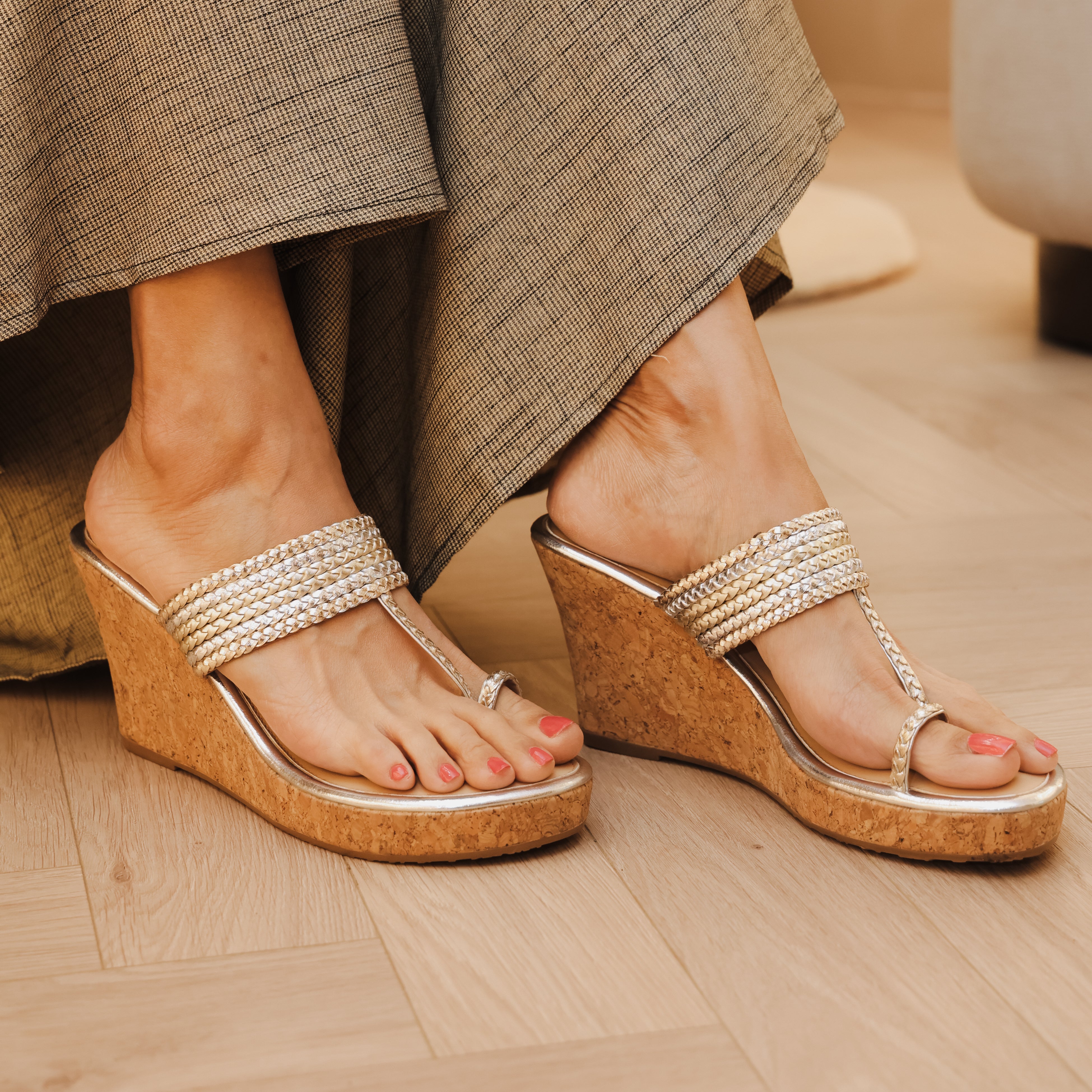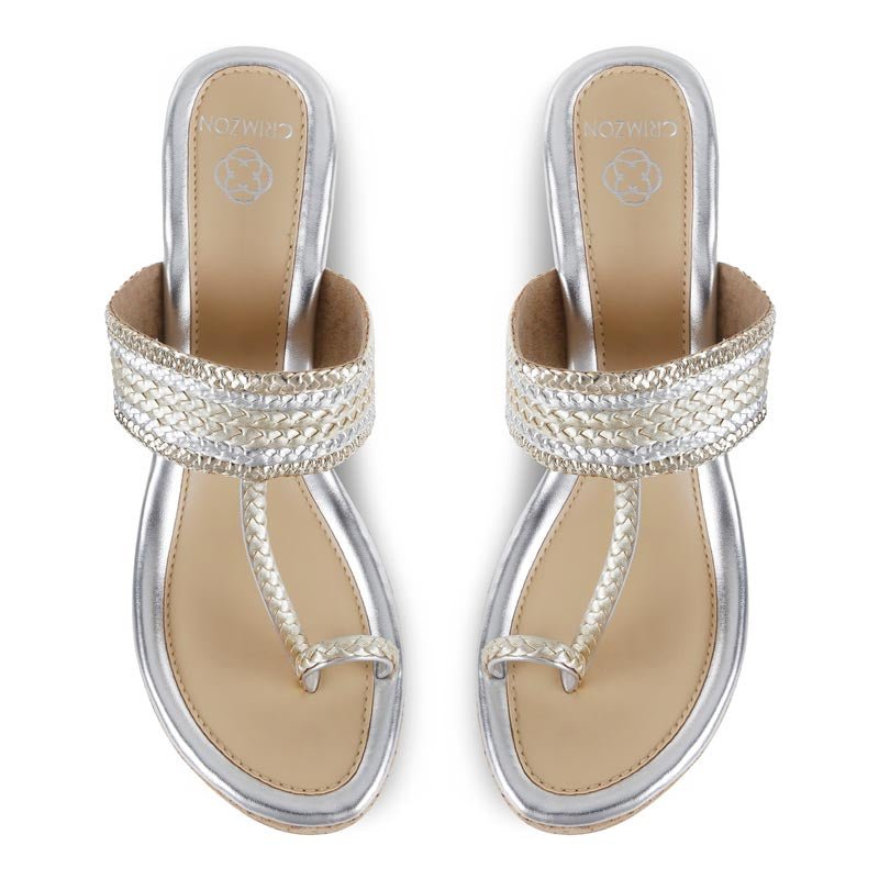 This Kolhapuri wedge is a play of fine gold and silver braids interlocked together against an exquisitely crafted wedge.