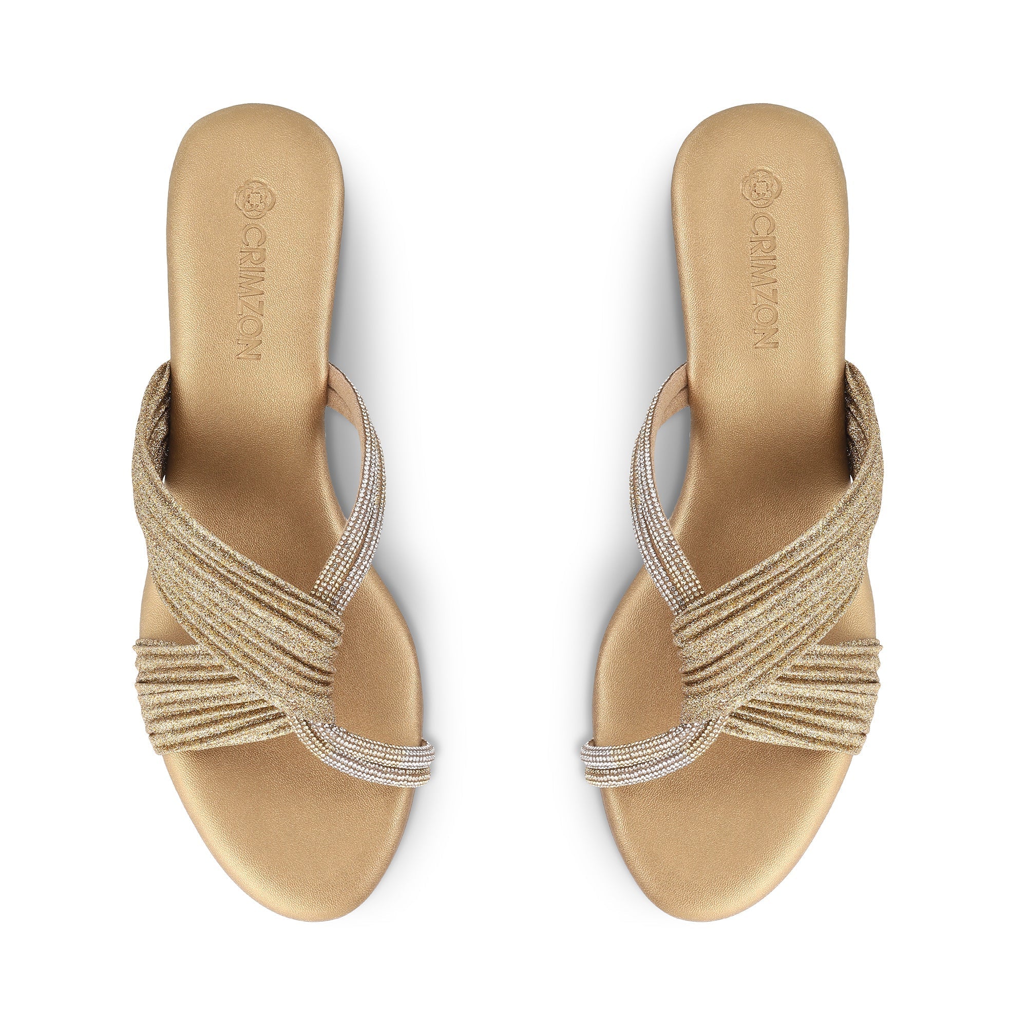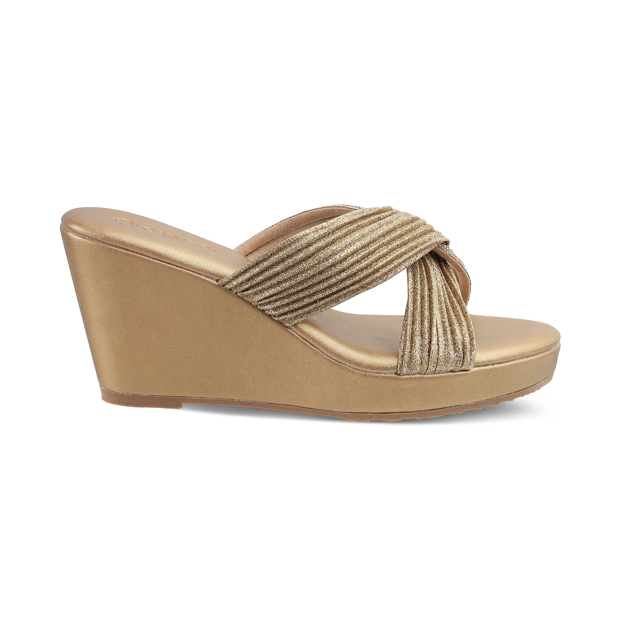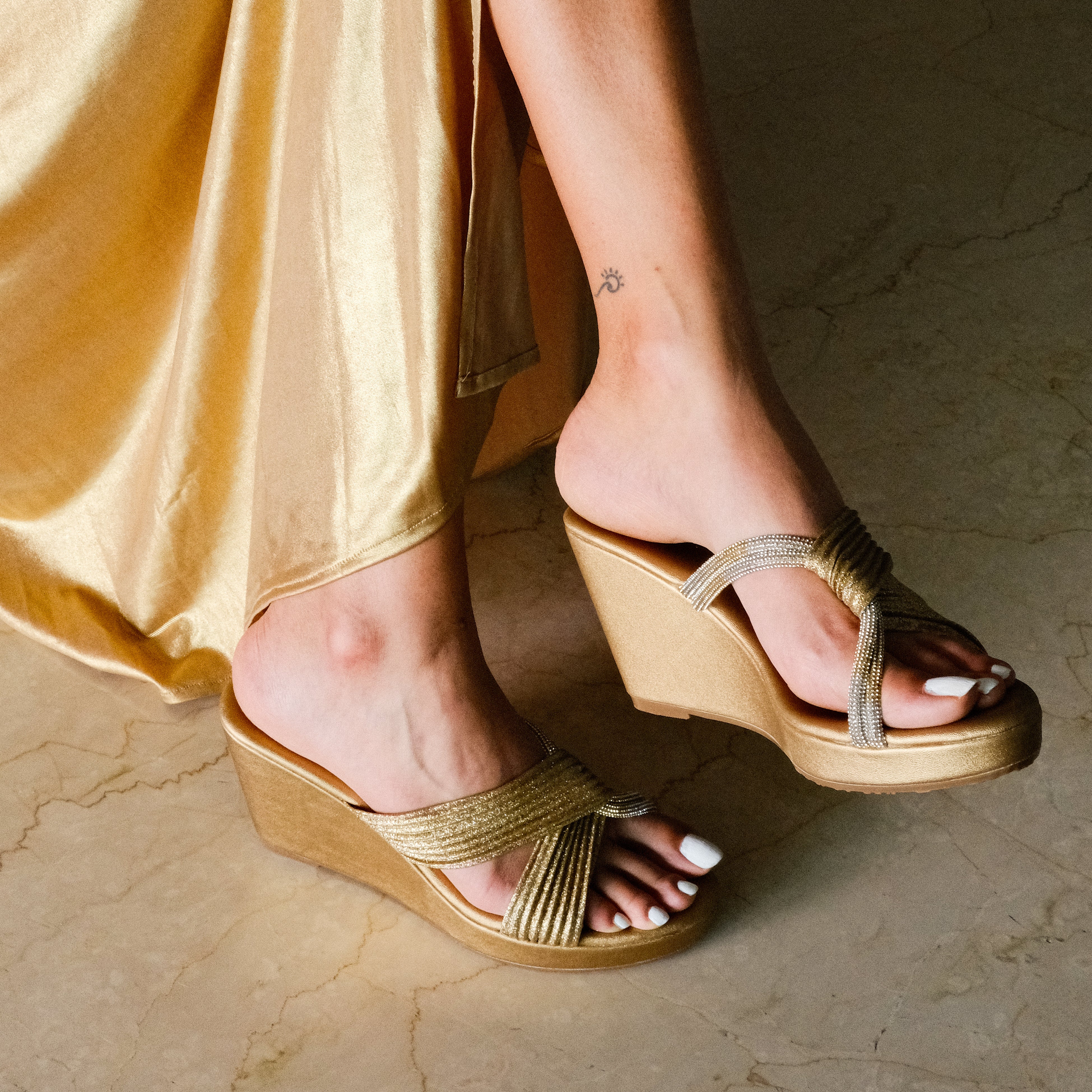 Indulge in timeless elegance with our charismatic antique gold wedges. Crafted with care, they feature exquisite pearl and diamond-studded lace atop a luxurious antique gold pleated fabric. The padded insole ensures comfort, while the wedge with a platform adds a touch of sophistication to any ensemble.