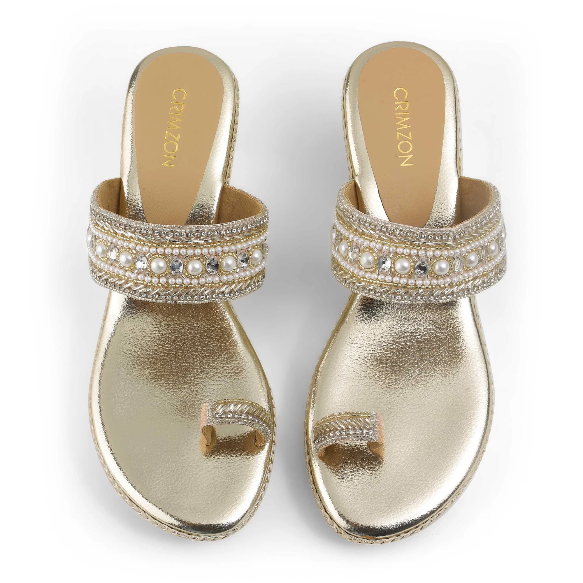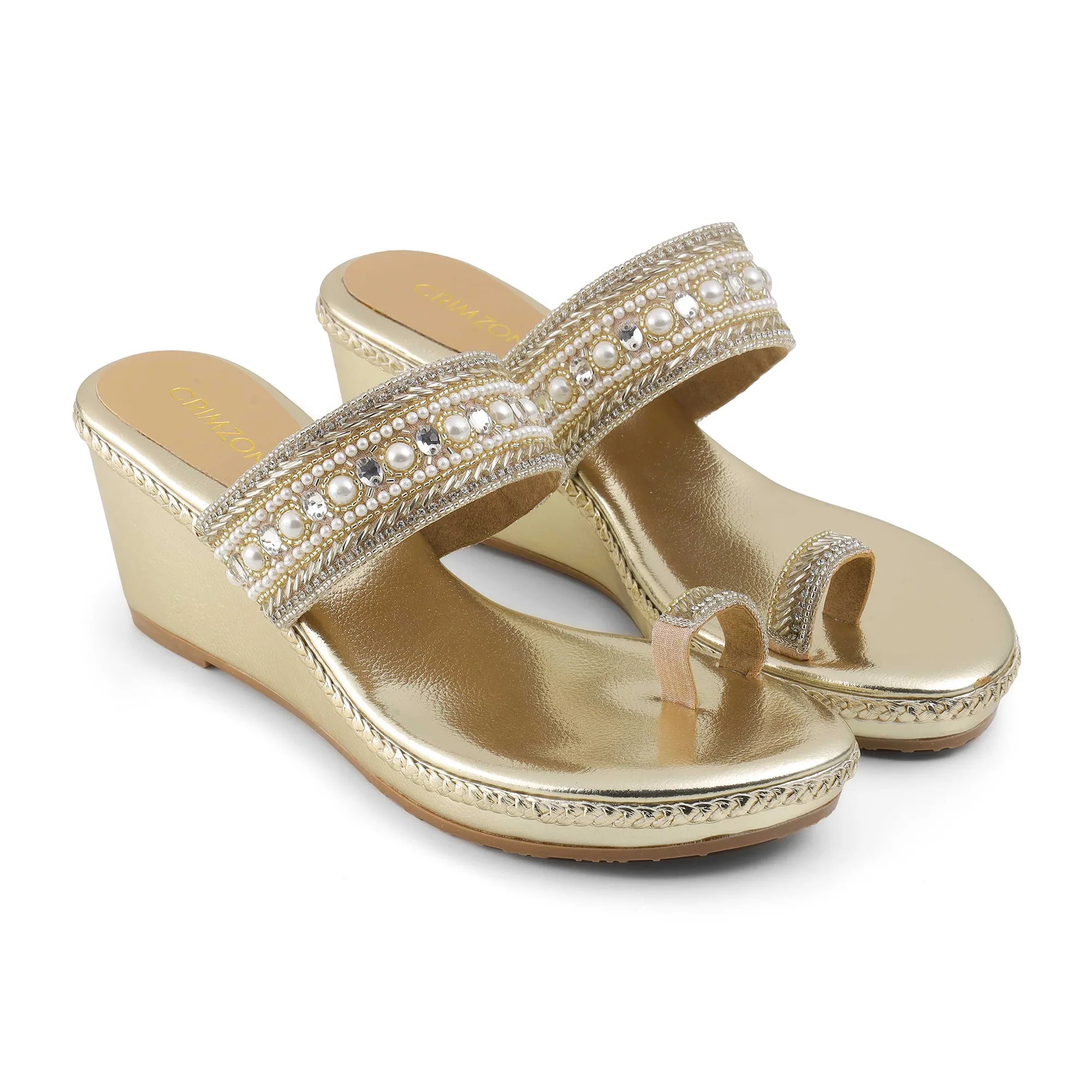 This Kolhapuri wedge is a play of fine gold and beige braids interlocked together against an exquisitely crafted wedge.