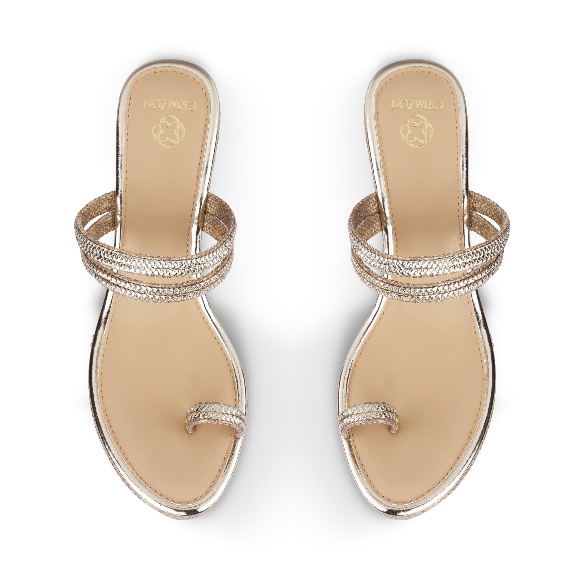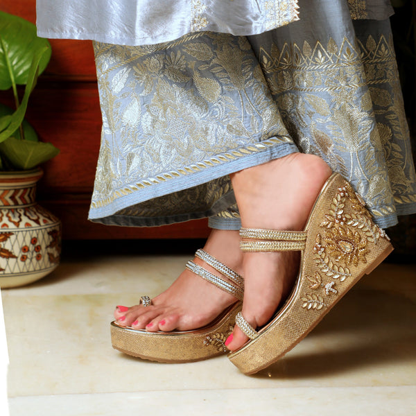 This versatile pair of Shaiza, gold heel embroidered wedges are a wedding season staple. Pack this ladies footwear for a destination wedding, and you’re guaranteed a pair that will match all your traditional outfits.
