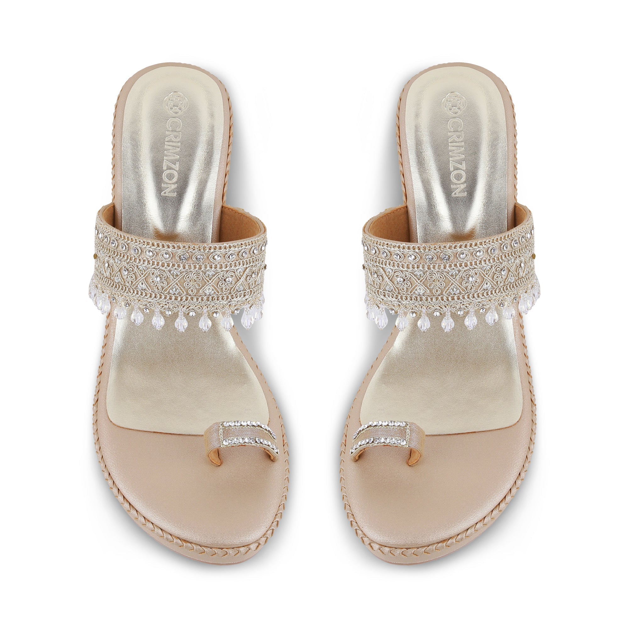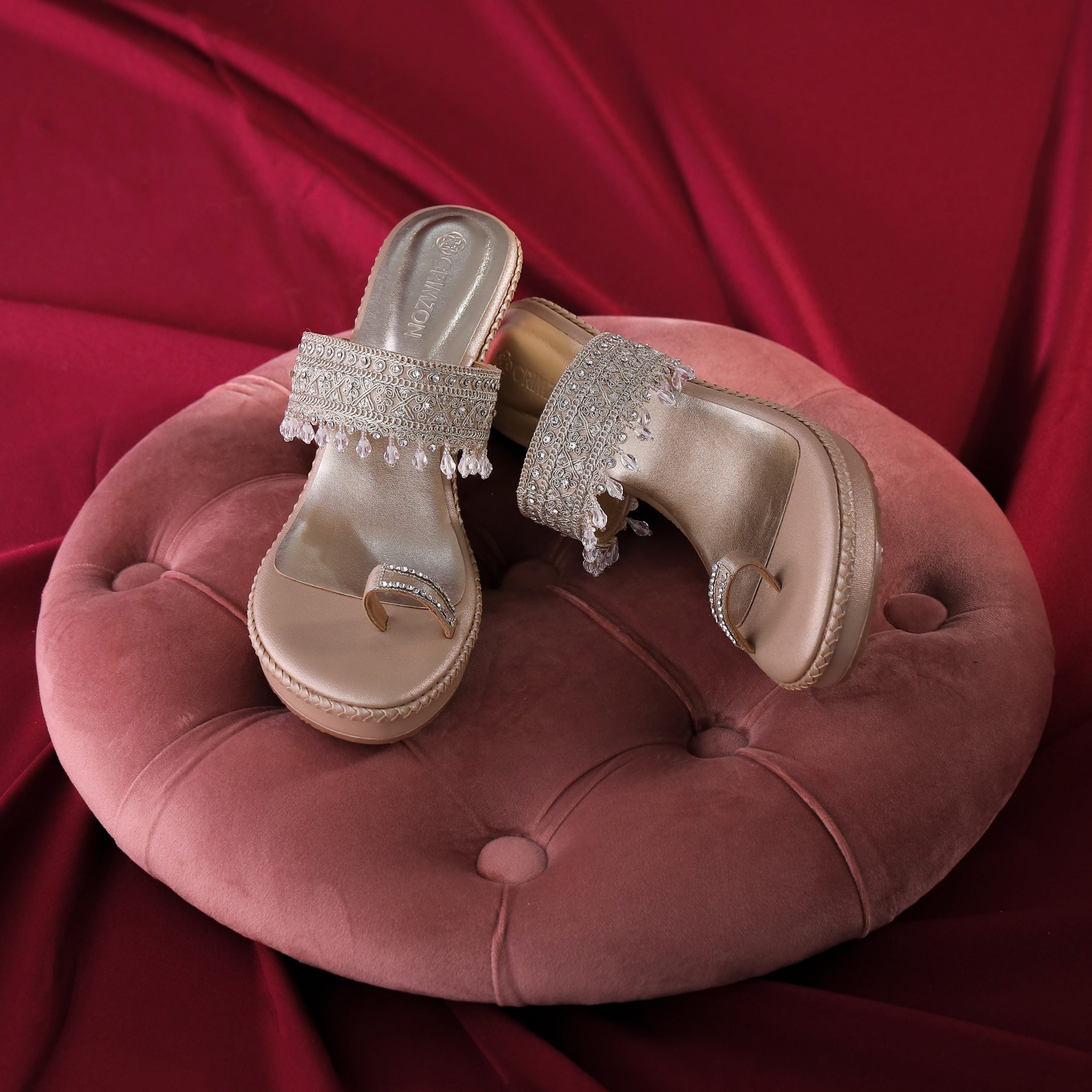 Indulge in timeless elegance with our charismatic silver wedges, Suhana. Crafted with care, they feature exquisite diamond studded embellished upper. Style these versatile wedges with countless Indian outfits, to bring a sparkle to your look.