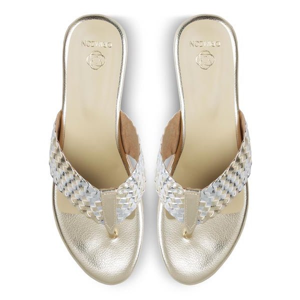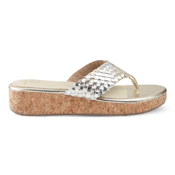 Comfort meets style in this pair of ladies footwear. These gold silver woven flatforms add height without creating a steep incline.