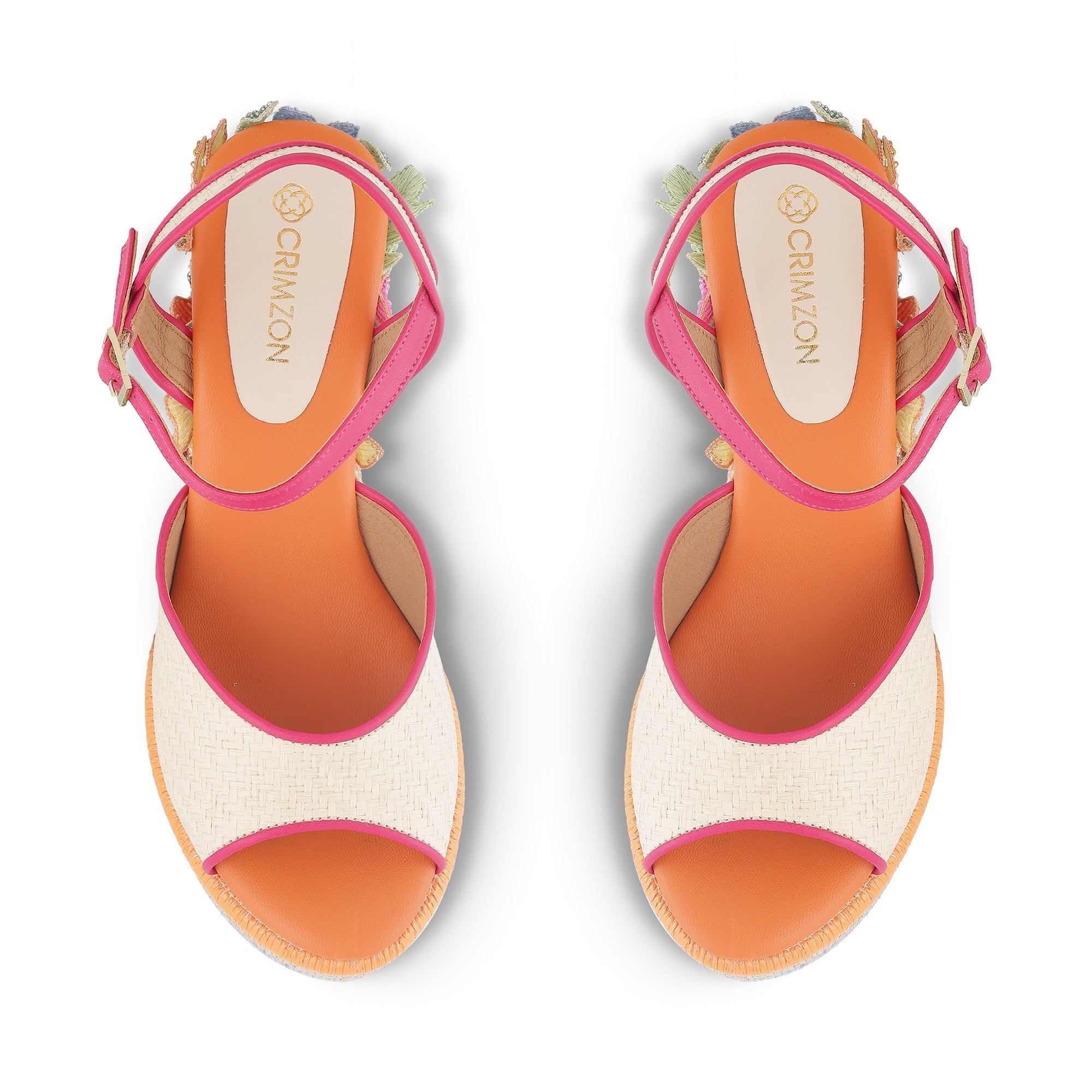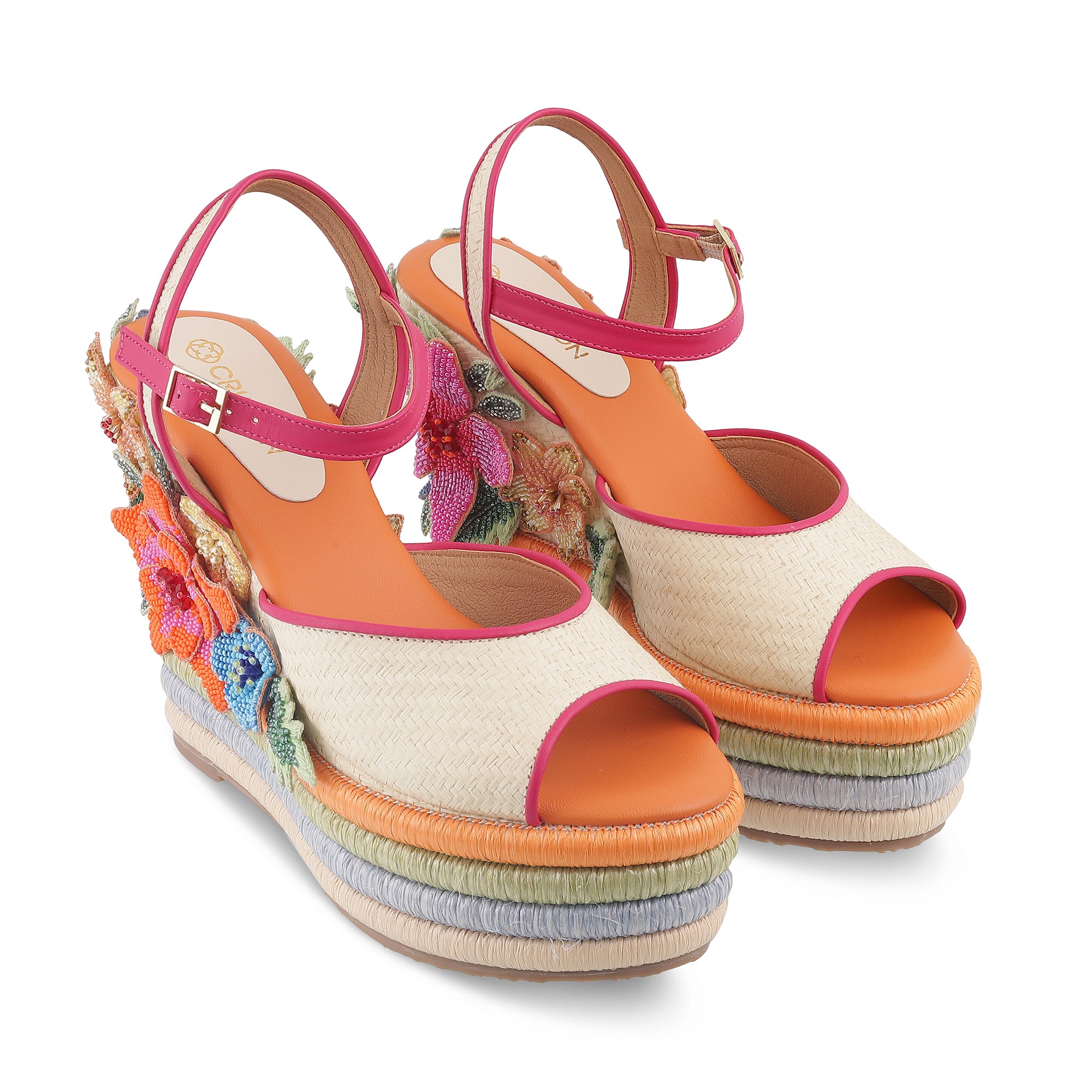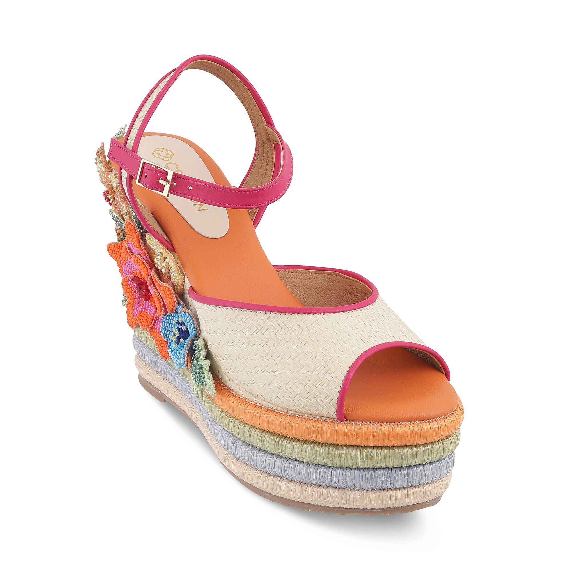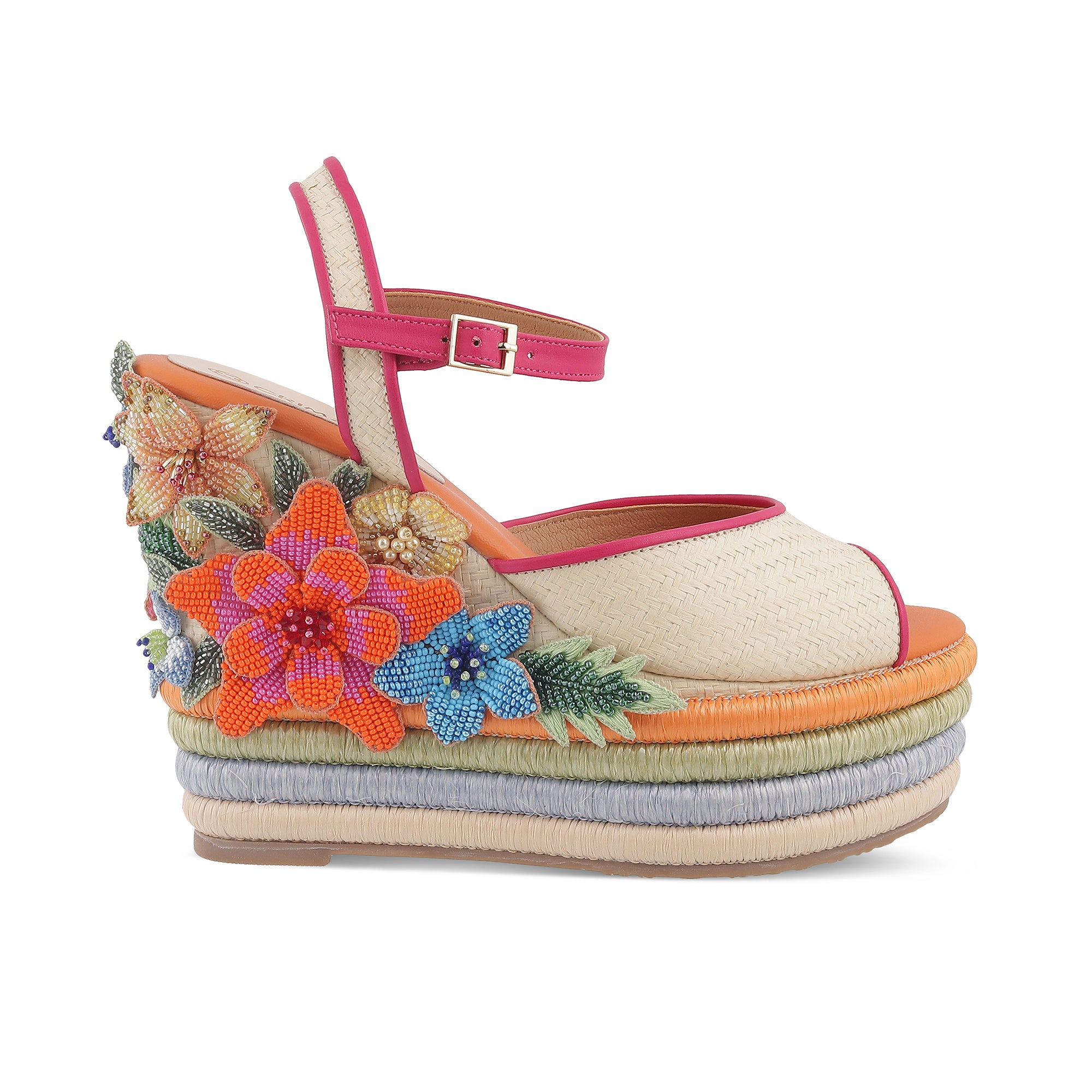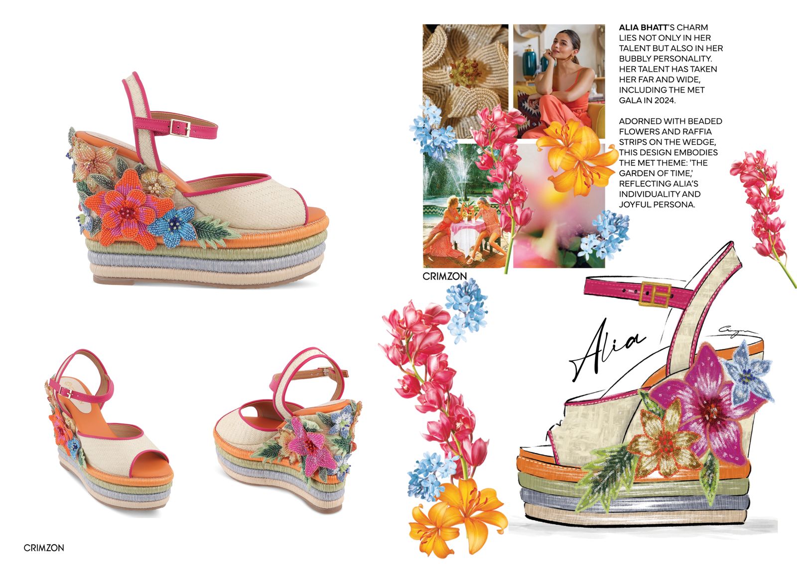 Inspired by Alia Bhatts Charm, adorned with beaded flowers and raffia strips on the wedges, this design embodies the MET theme: "The garden of time" reflecting Alias individuality and joyful persona