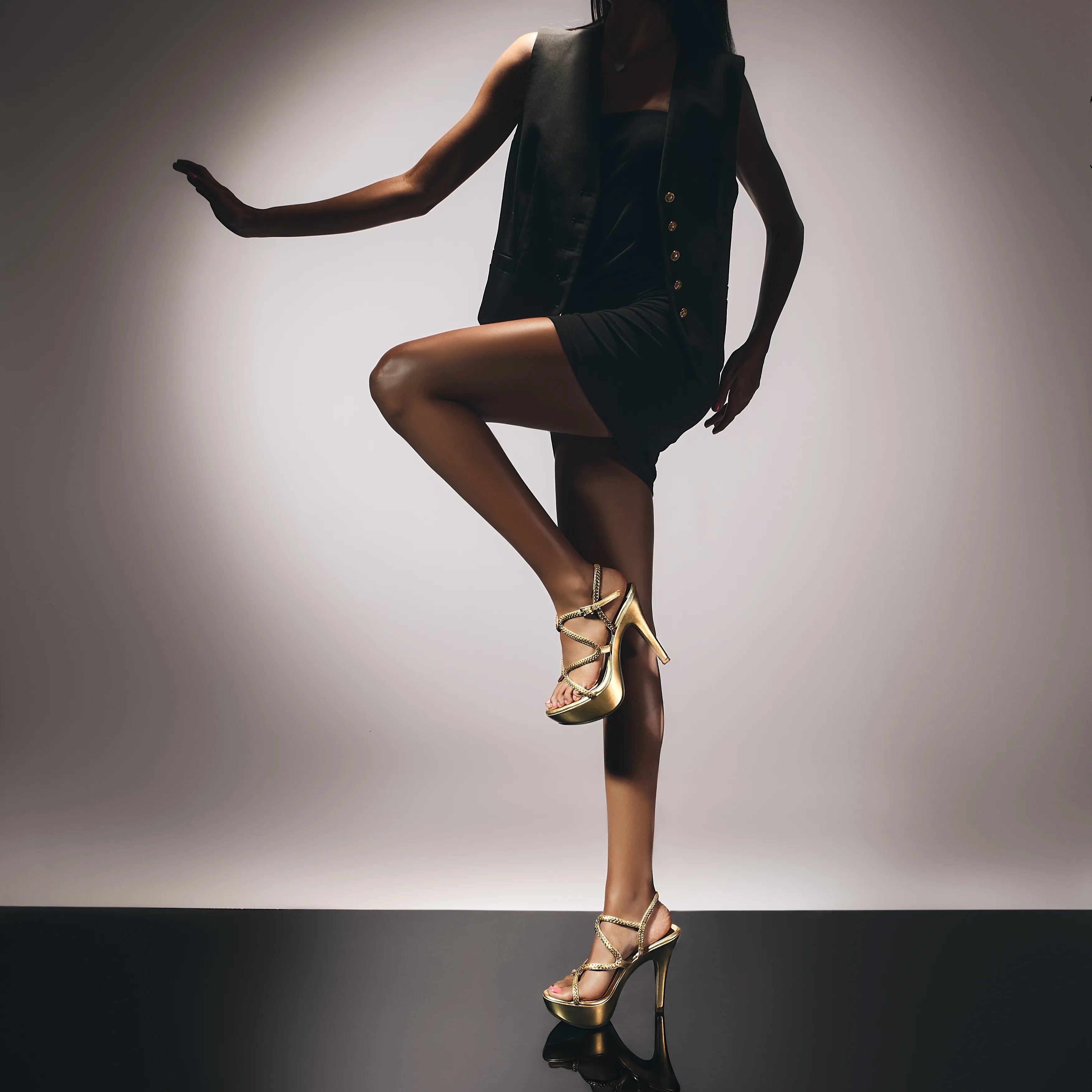 Make an unforgettable entrance with Alicia, Crimzons dazzling gold stiletto. Standing tall, this striking pair blends glamour and sophistication, perfect for those who love to make a statement. The intricate braided straps create a unique, elegant design, while the adjustable ankle strap ensures a comfortable and secure fit. With Alicia’s radiant gold finish, you’re sure to shine at every occasion, adding a luxurious touch to any outfit.