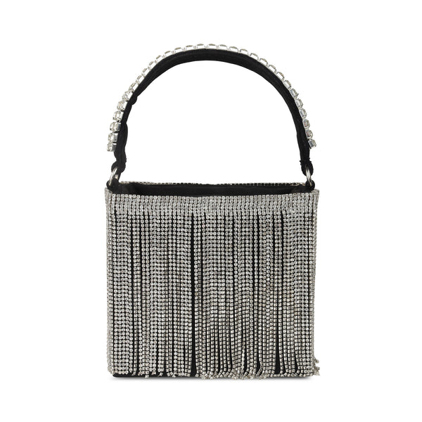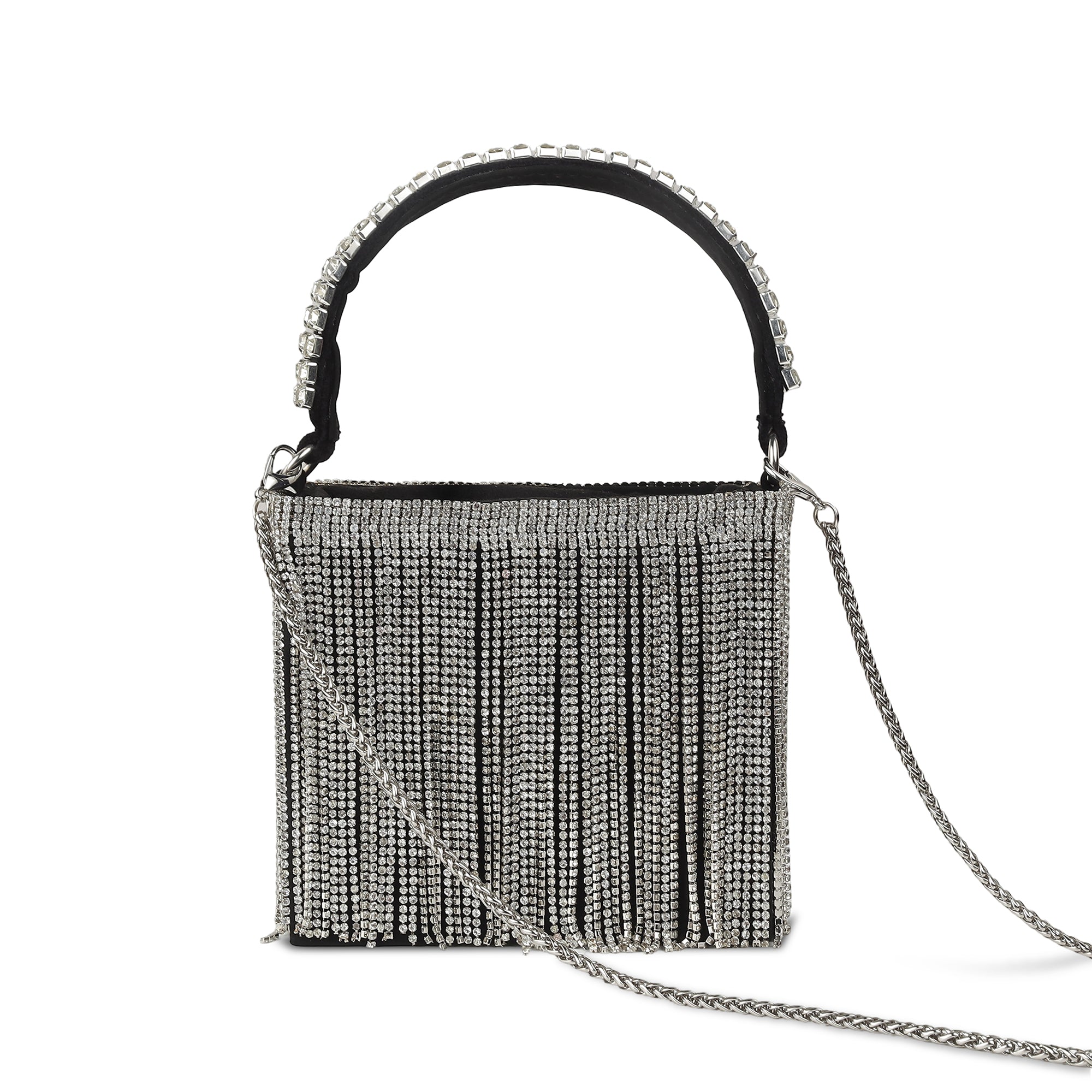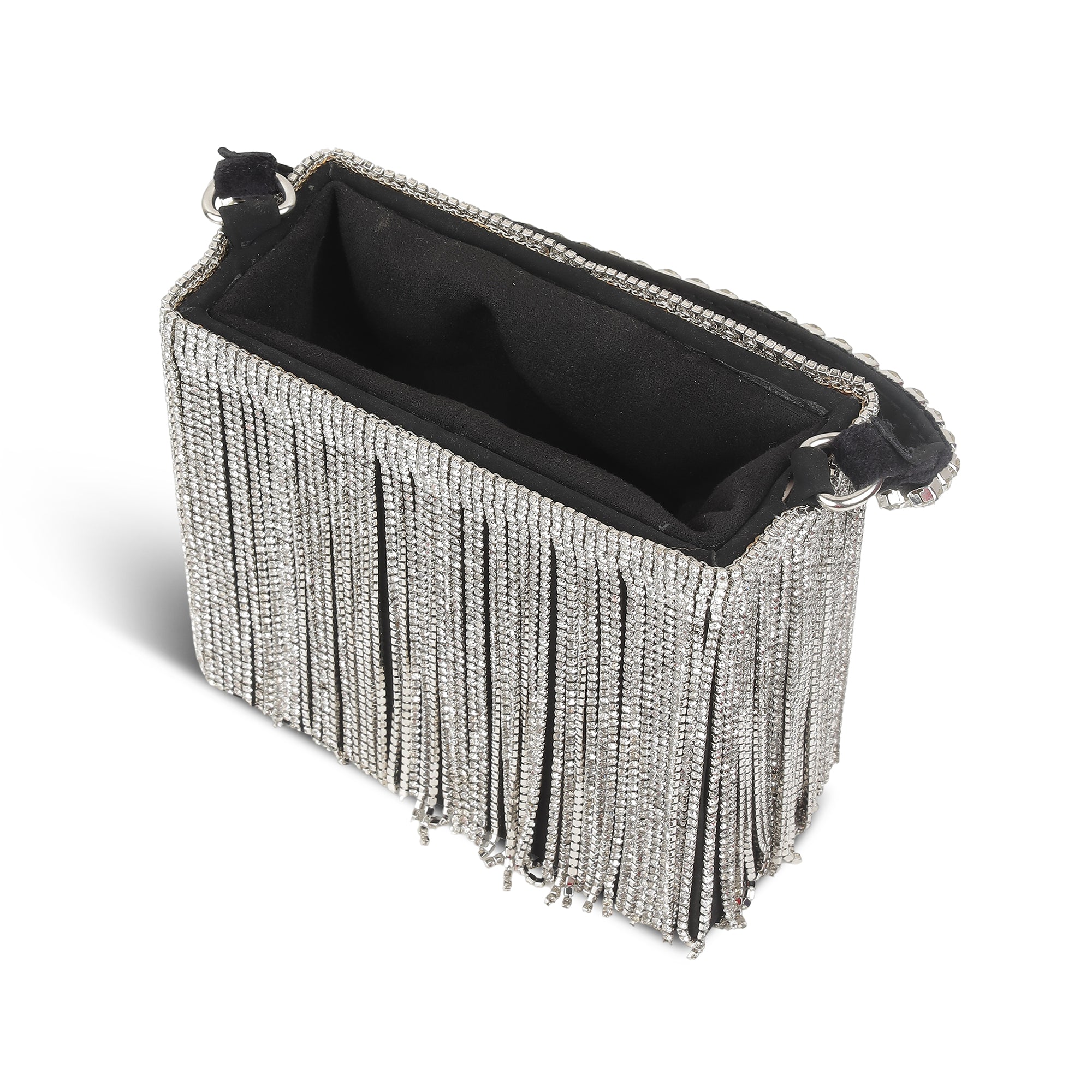 Step into refined luxury with the Deepika Mini Sling Bag in Black. Featuring striking black fabric as a base for cascading rhinestone fringes and a dazzling studded handle, this bag is both bold and sophisticated. Its compact size makes it ideal for festive occasions, cocktail parties, or a glamorous night out. Elevate your ensemble effortlessly with this chic accessory.