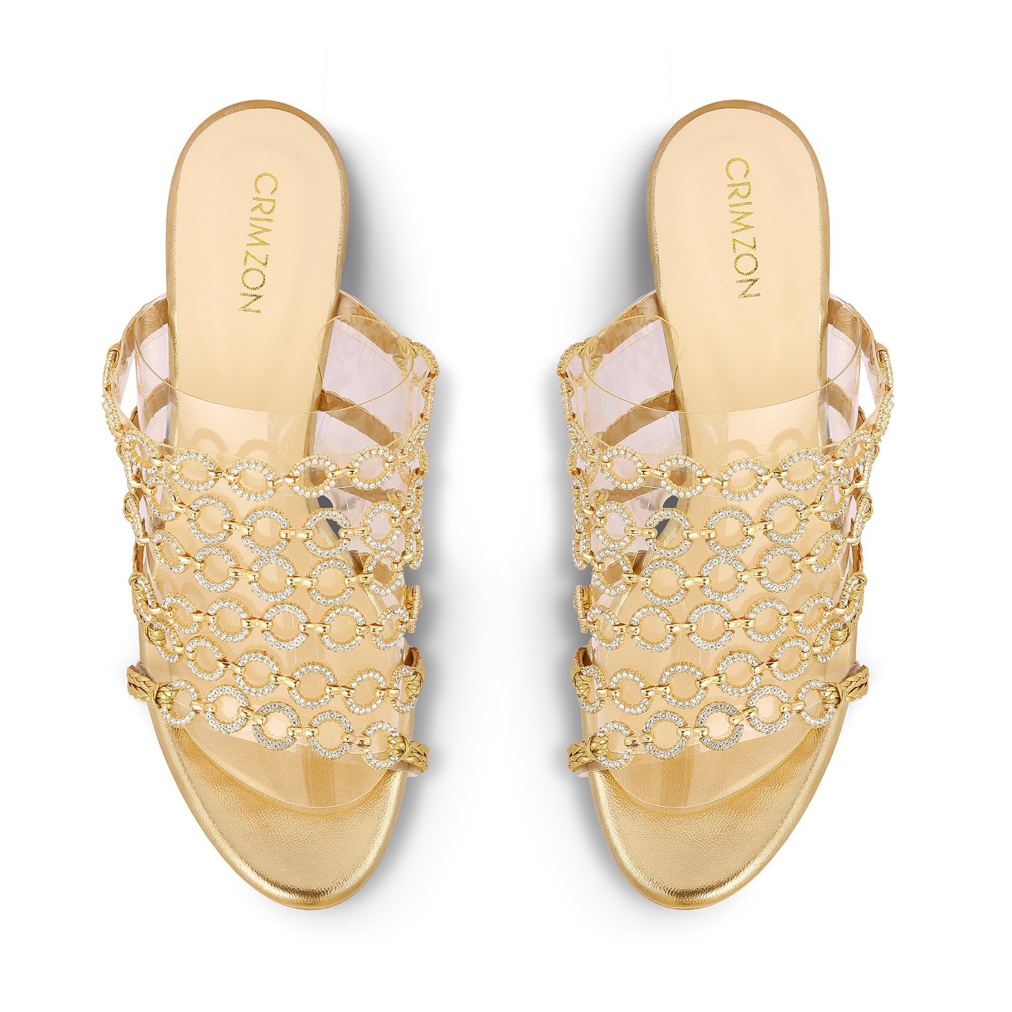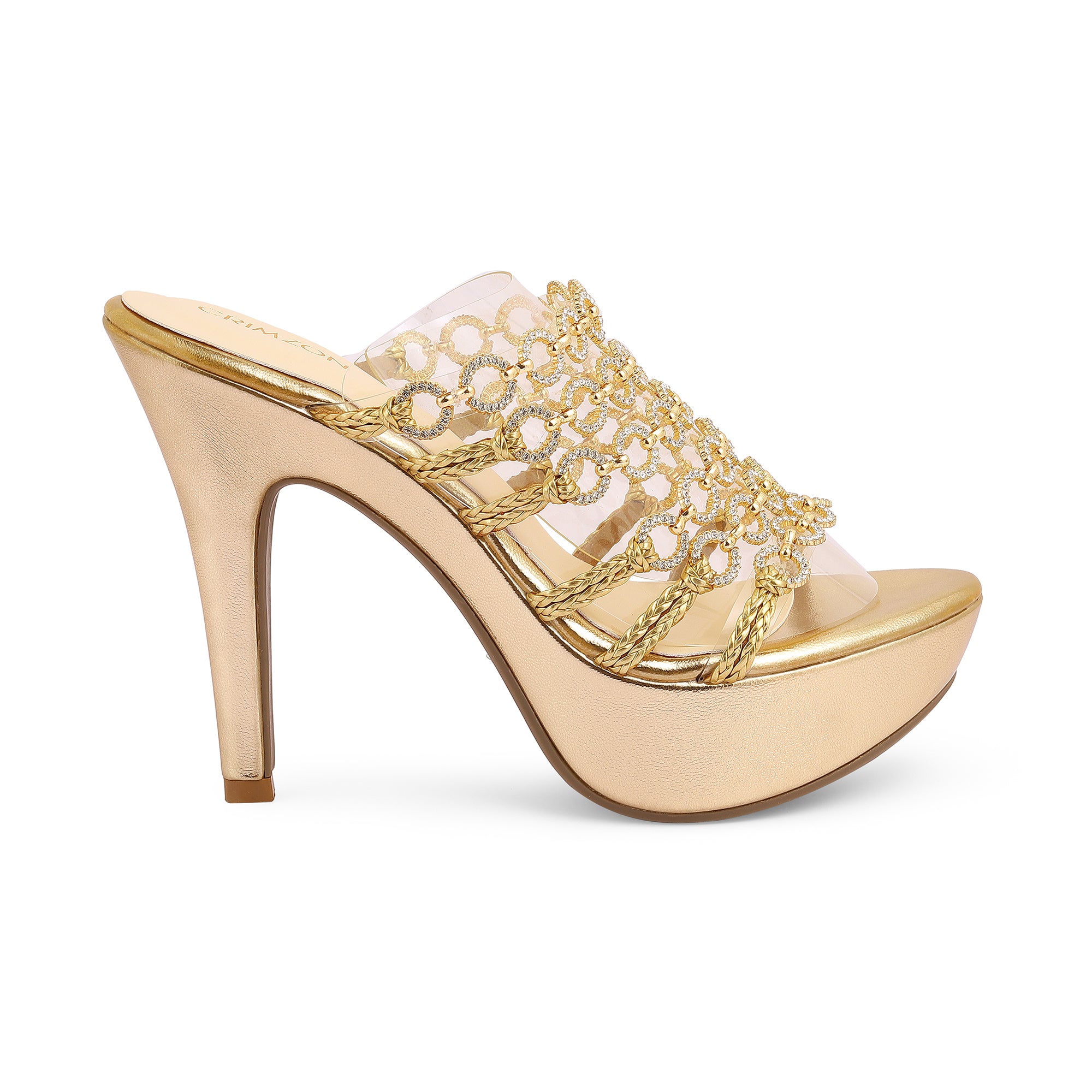 Introducing Madhuri by Crimzon—an exquisite pair of stilettos that brings unmatched elegance to your wardrobe. Designed with stunning gold chain-link straps adorned with crystal accents, these heels offer a perfect blend of glamour and sophistication. Set on a sleek stiletto heel, Madhuri offers both height and allure, ideal for evening soirées or special occasions where you want to make a lasting impression.
