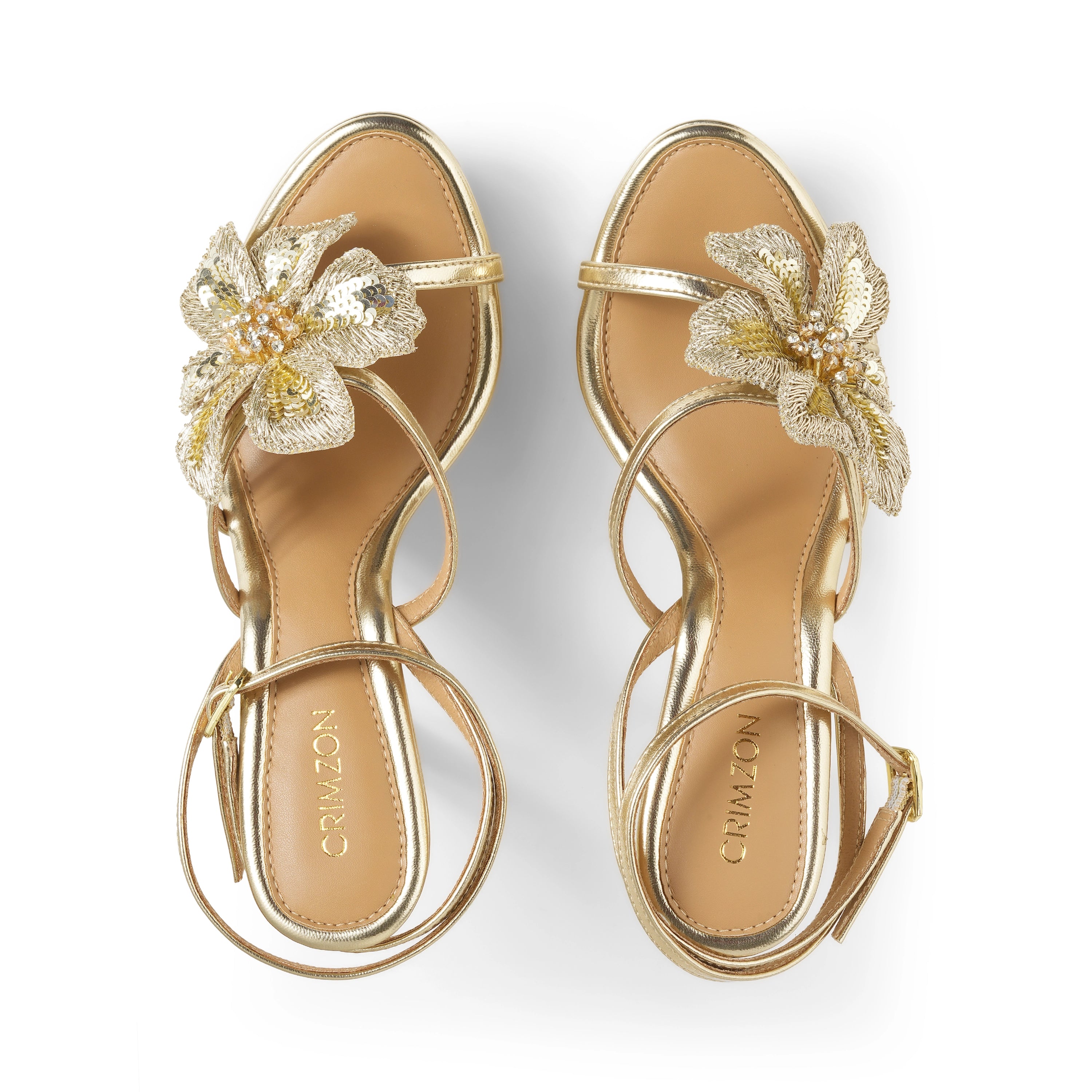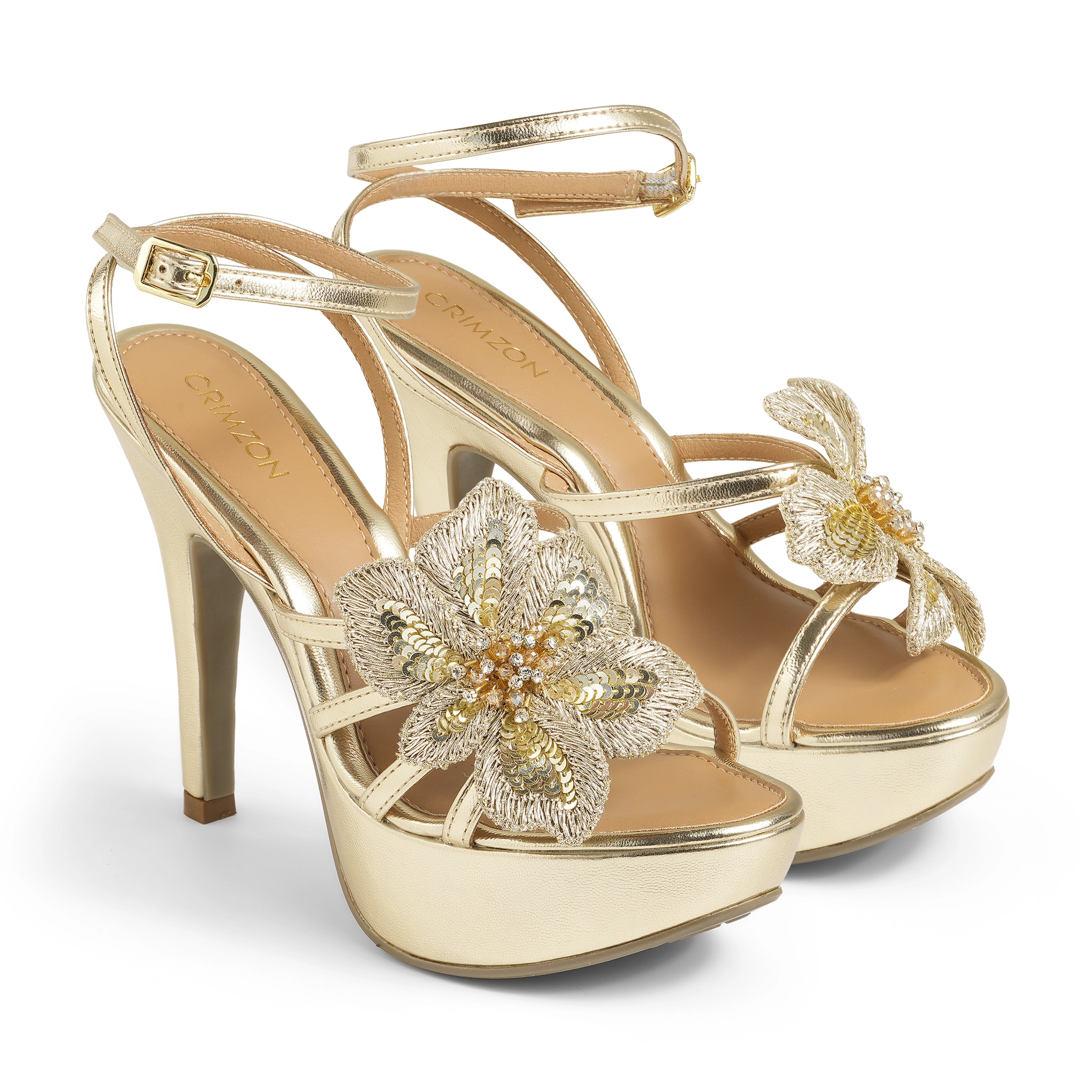 The Crimzon Kaia Heels bring a touch of refined fantasy to your evening style. Crafted in glossy metallic gold, they feature slender crossover straps and a beautifully hand-embellished butterfly motif that adds instant glamour. The sleek stiletto heel offers elegant height while keeping the silhouette delicate and feminine.