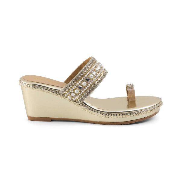 This Kolhapuri wedge is a play of fine gold and beige braids interlocked together against an exquisitely crafted wedge.