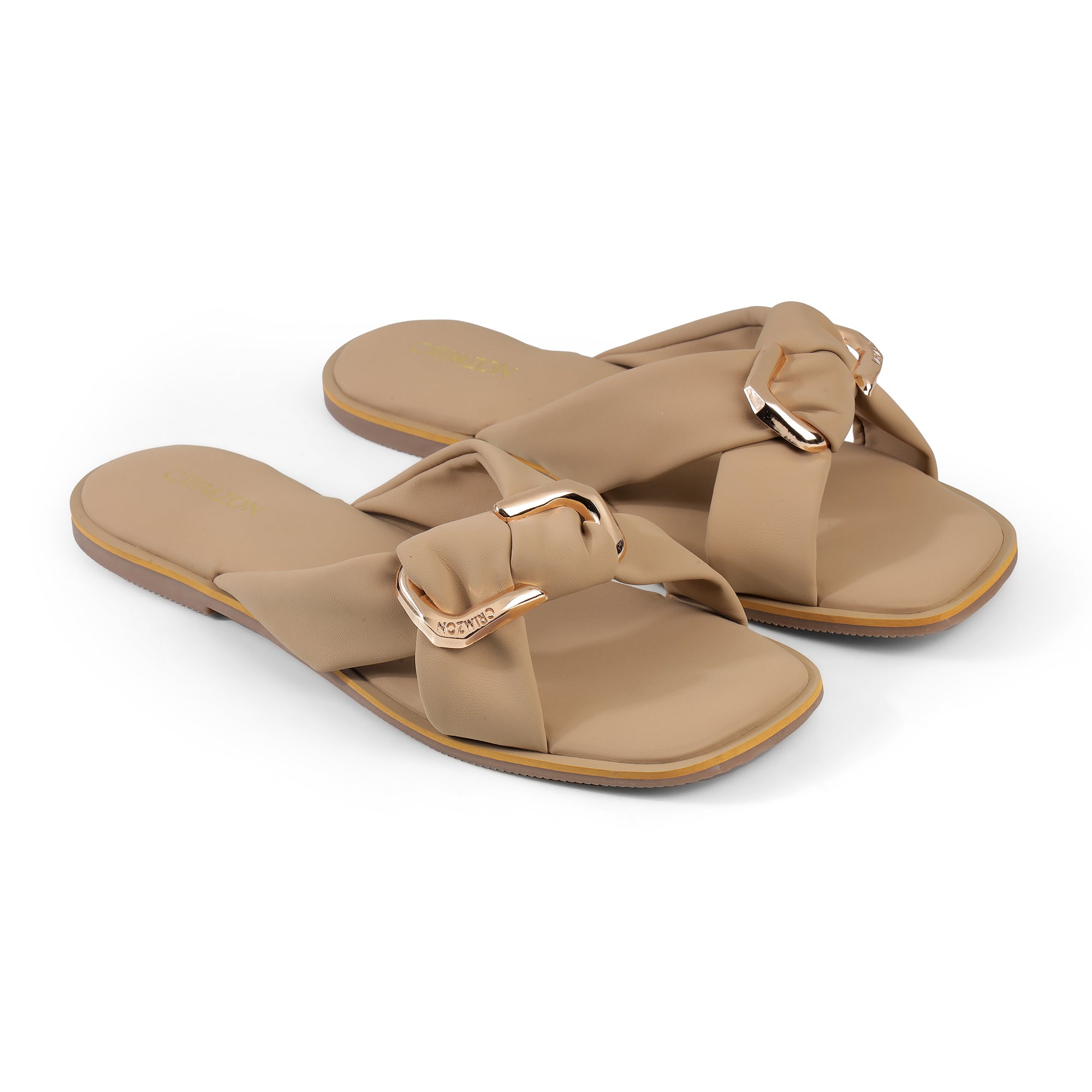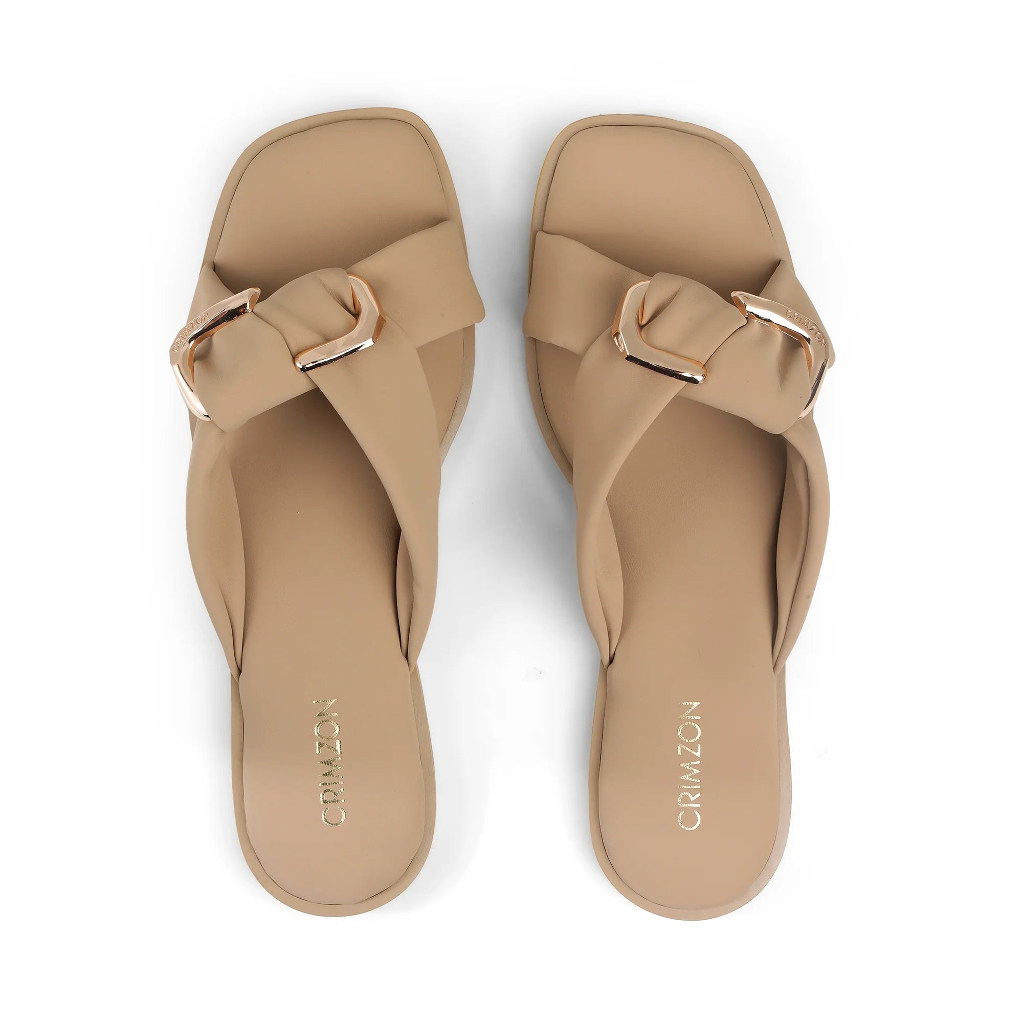Effortless elegance meets everyday comfort in the Crimzon Reese Flats. Designed in a warm, versatile beige tone, these slip-ons feature plush padded straps accented with a bold, gold-tone buckle engraved with the Crimzon logo. The cushioned insole ensures cloud-like comfort, while the lightweight sole makes them ideal for all-day wear. From casual coffee runs to evening get-togethers, Reese adds a polished finish to every outfit.