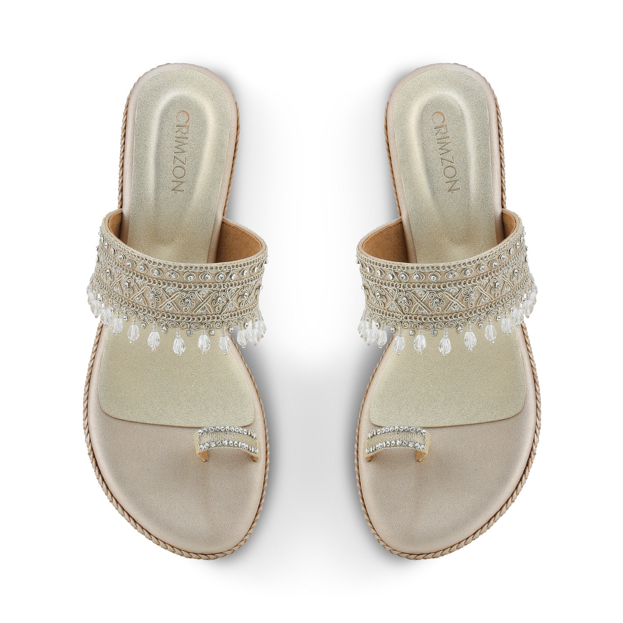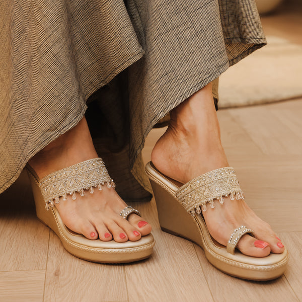 Indulge in timeless elegance with our charismatic silver wedges, Suhana. Crafted with care, they feature exquisite diamond studded embellished upper. Style these versatile wedges with countless Indian outfits, to bring a sparkle to your look.