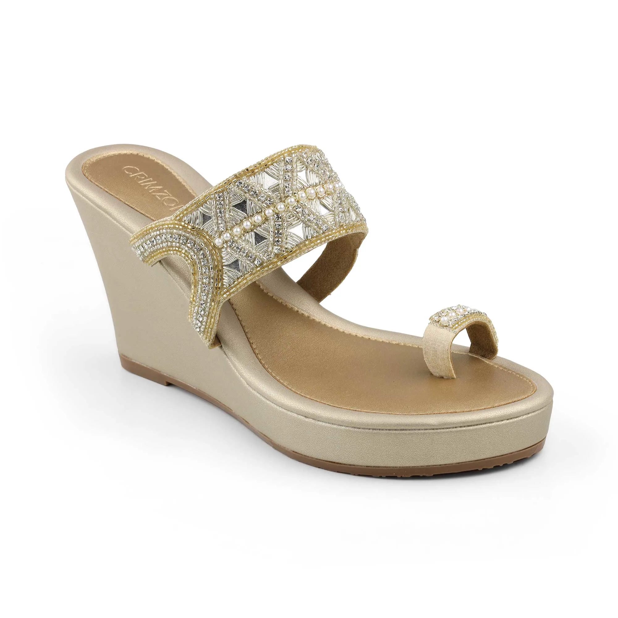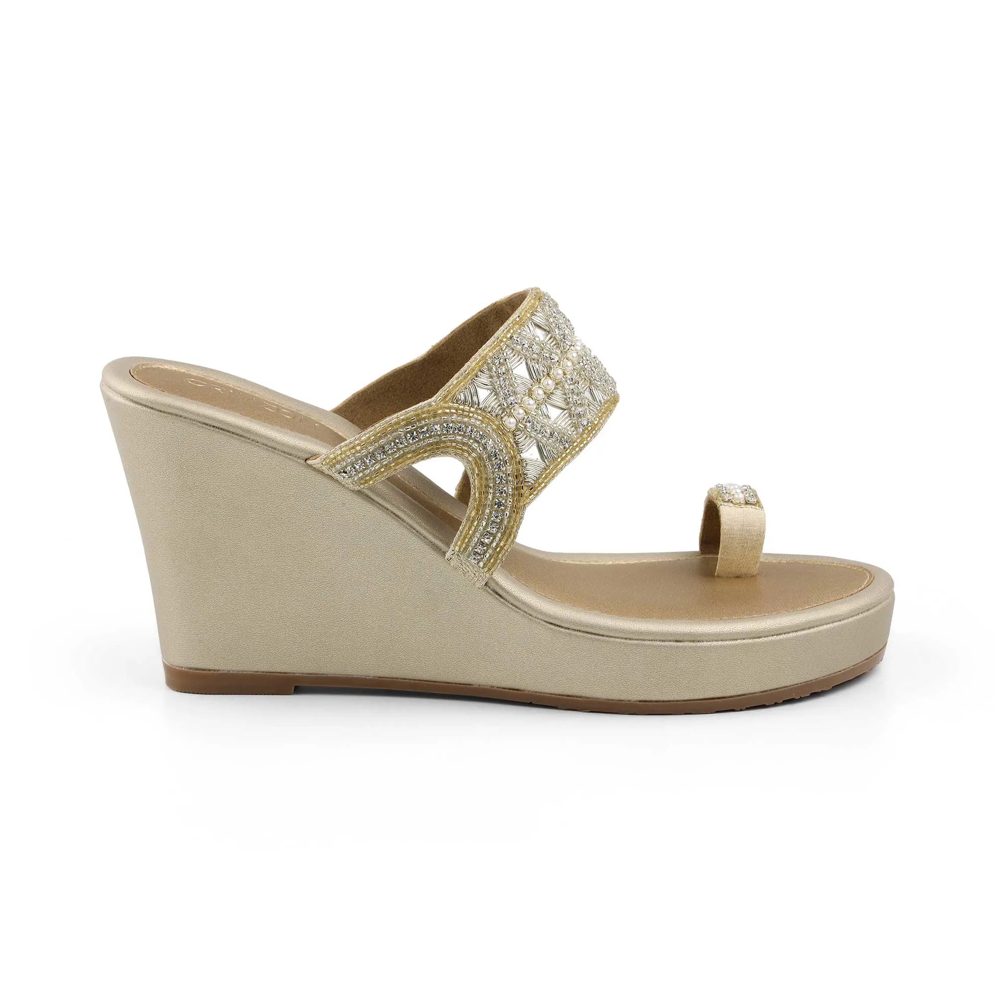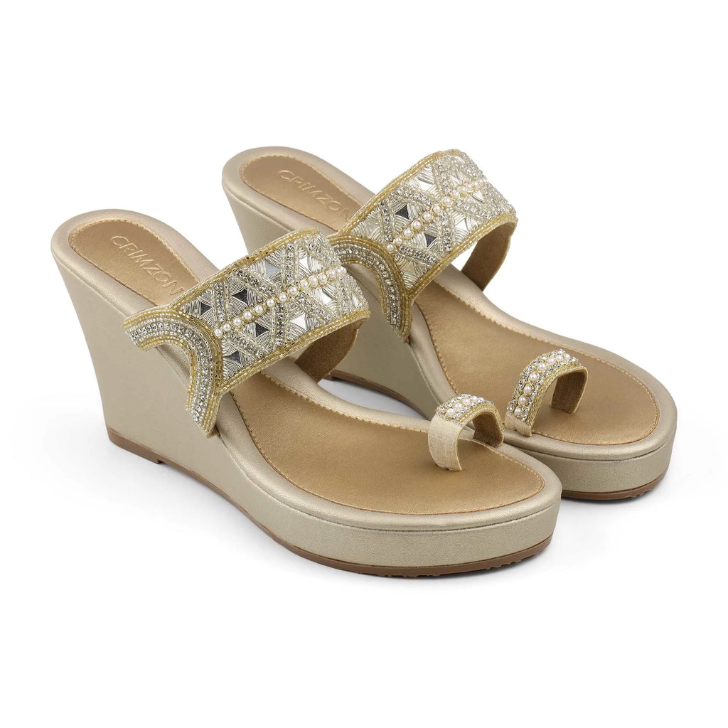 Step into festive sophistication with Myra. Handcrafted in a radiant champagne hue, these wedges feature intricate mirror and pearl embellishments that capture light beautifully with every step. Designed with a soft cushioned footbed and elevated wedge heel, Myra blends comfort and glamour effortlessly, perfect for celebrations, soirées, and everything in between.