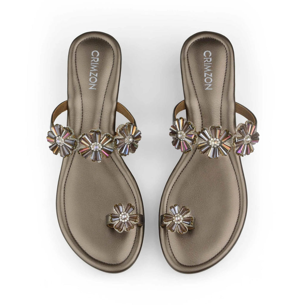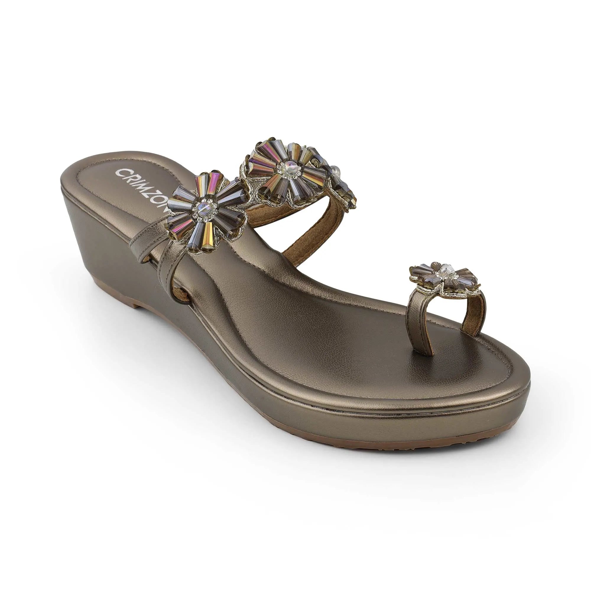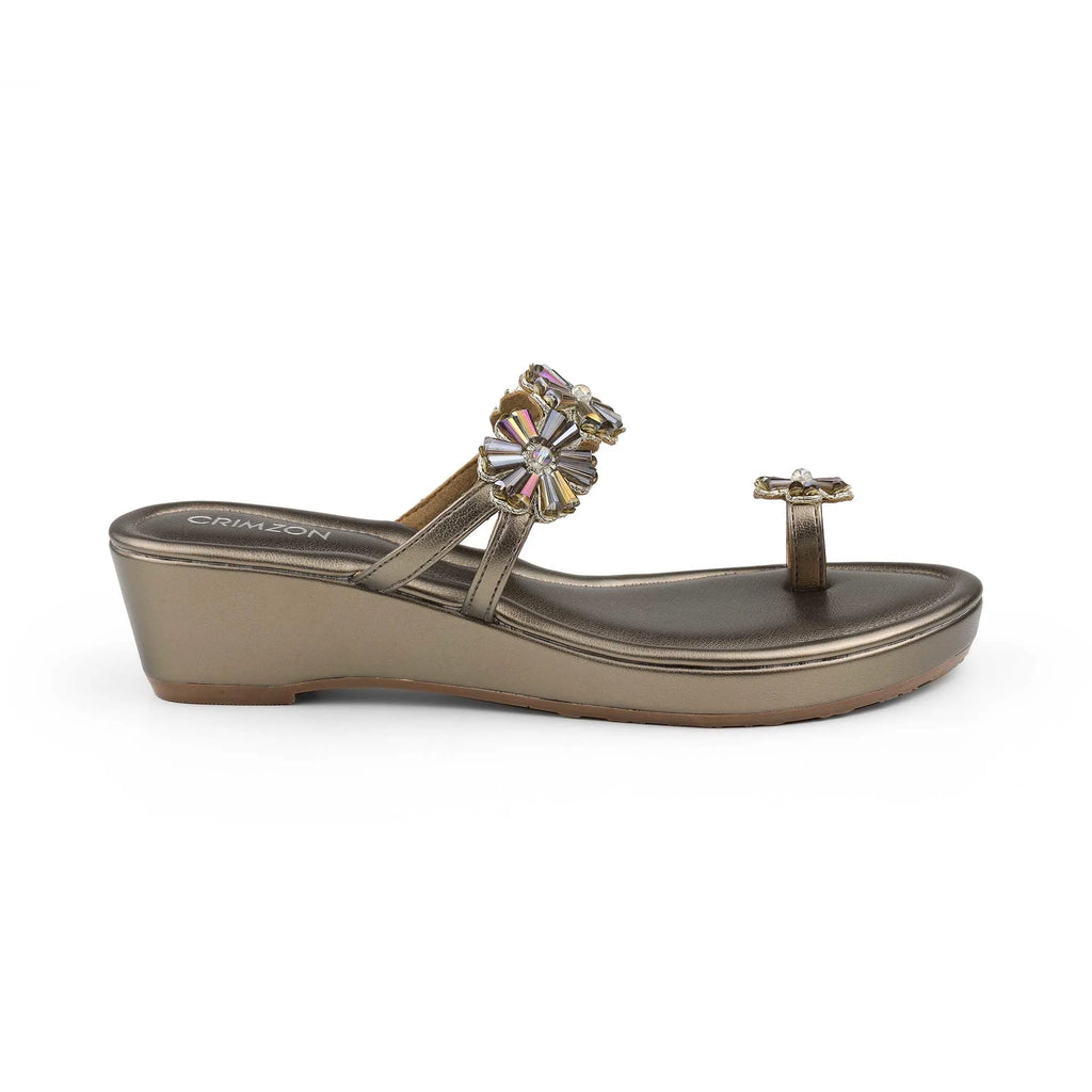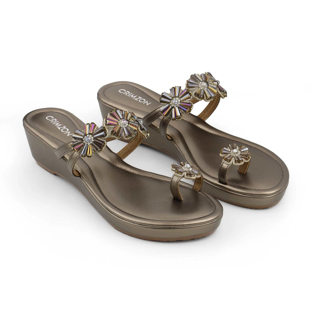 Step into regal elegance with the Parijat Kolhapuri Wedges in Gunmetal. These comfortable wedges feature a striking metallic base and an intricate, jeweled floral strap, perfectly blending traditional style with modern glamour. The subtle wedge heel provides lift and comfort, making them the ultimate statement footwear for any wedding, party, or special festive occasion.