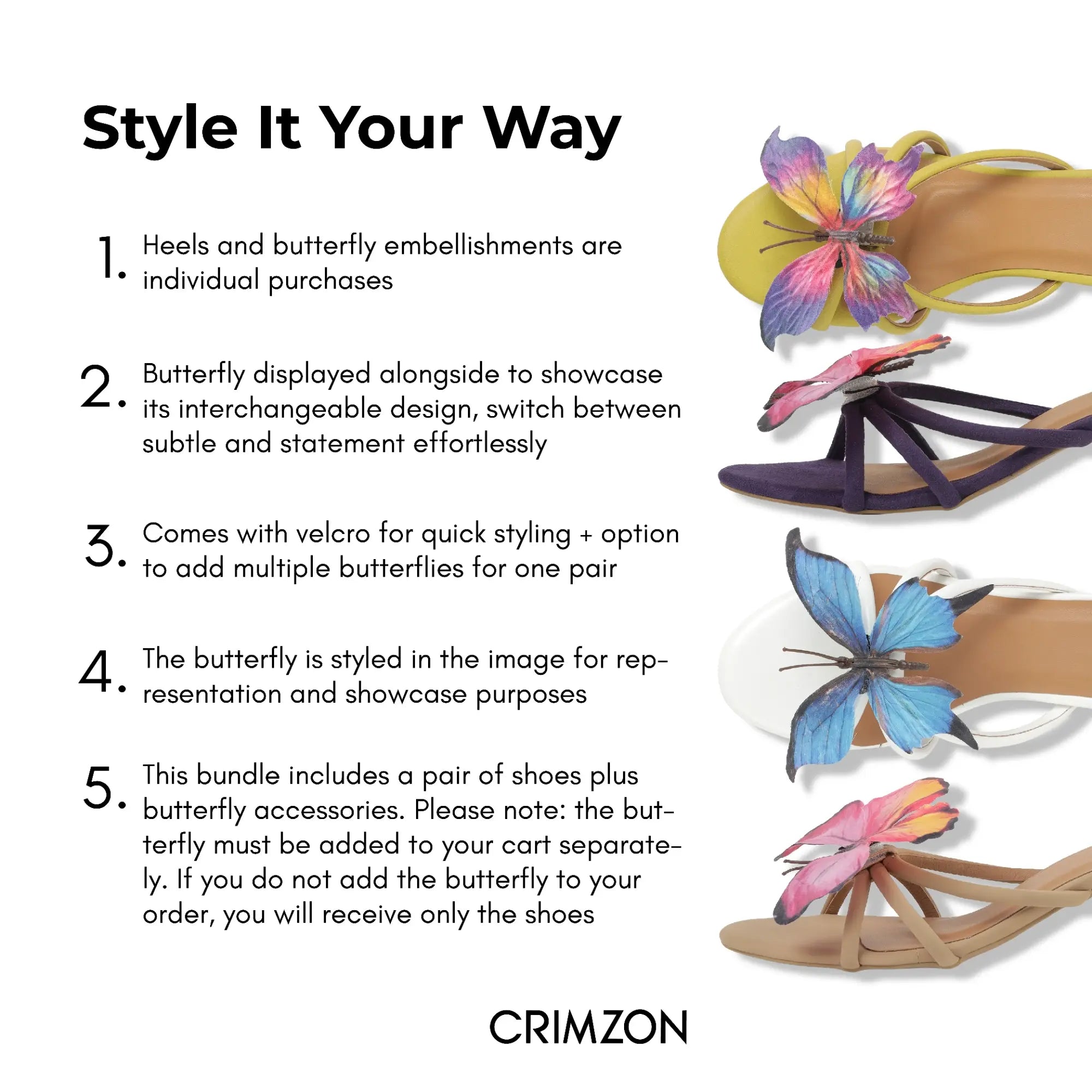 The Mariposa Heels are a celebration of playful elegance and versatile design. Adorned with delicate detachable butterfly embellishments, they allow you to transition effortlessly between statement glamour and subtle sophistication. Crafted for comfort with a striking silhouette, they’re perfect for occasions that call for a touch of whimsy. Expressive yet refined, these heels bring a dynamic charm to modern dressing.
